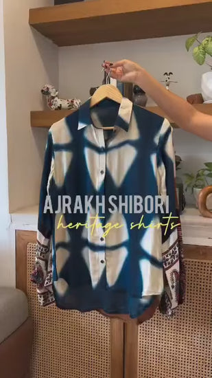 A stylish navy-blue shirt featuring a soft, flowy silhouette with bold tie-dye print patterns and intricately printed wide cuffs. Perfect blend of contemporary chic and ethnic detailing for an elegant, effortless look.