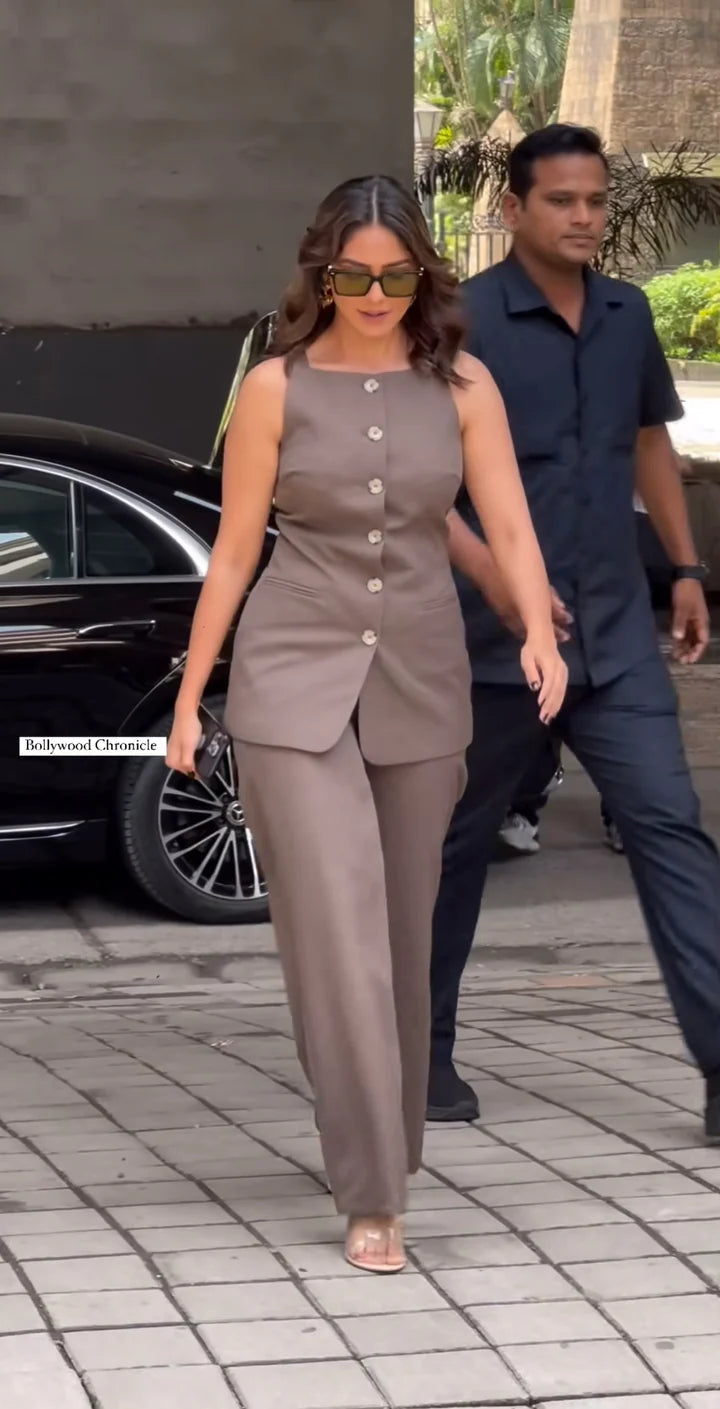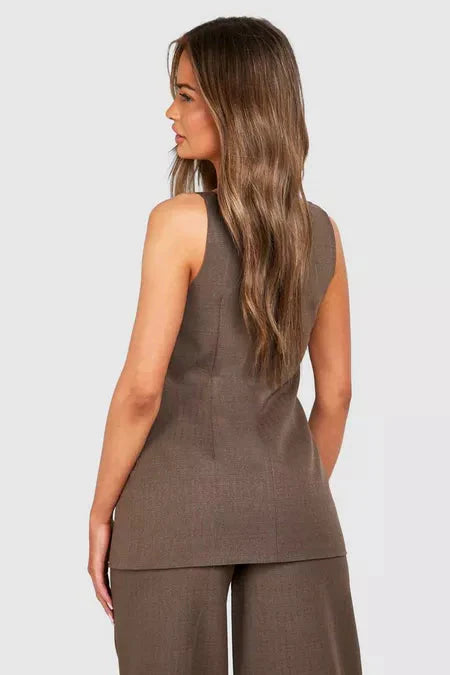 This brown vest and pant set features a stylish, slightly longer vest for a refined look, paired with tailored pants. Made from premium cotton, this set is both comfortable and effortlessly chic, ideal for versatile styling.